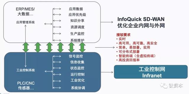 如果SD-WAN能够在企业网里做好梳理的工作,然后对接给工业控制网,运行起来的效率就会非常高,所以存在一个很强接驳的要求是实时性,而且是高可用、高可靠、高安全性,最好是简单易部署。