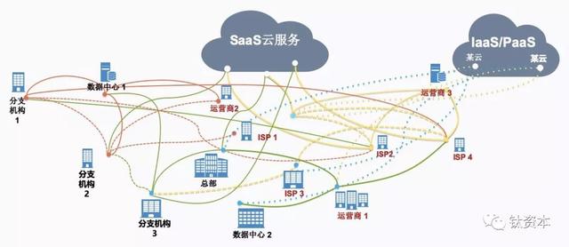 一个垂直行业的企业,可能不会拥有大量的数据中心,只不过租一些数据中心的机柜,还有很多的分支机构、团队或合作伙伴在外地,场景可能使用互联网或3G、4G,所以广域网的场景已经存在于其中——数据中心连分支公司、分支公司互连、分支公司上云等场景涉及SaaS、PaaS和IaaS;而分支公司连接个人、个人再上云连到数据中心等,比如涉及到在分支公司使用本地网、在外面用4G连网处理临时工作等。