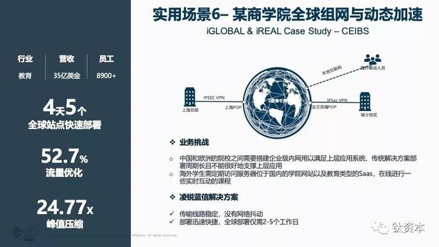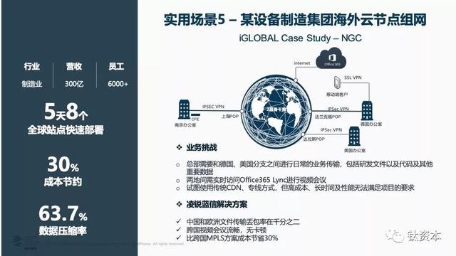 第五个场景,云节点组网和动态加速同时进行。现在很多企业要用海外云,主要是AWS、Office 365,用传统的方案拉条线做云节点组网会很麻烦,因为微软基本不允许其它专线进入微软的数据中心,这时组网就得走流程,但SD-WAN可以解决这一问题。