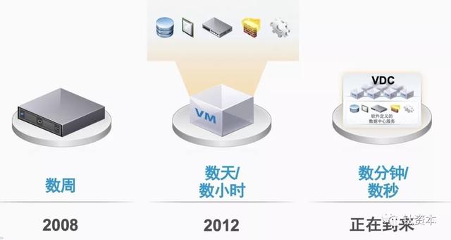 从2008年开始,云计算不仅在北美,也在中国市场开始兴起,整个系统可在数周内就完成部署。2012年的虚拟化技术,可以实现数天、数小时完成系统部署,而未来可能变得更快。