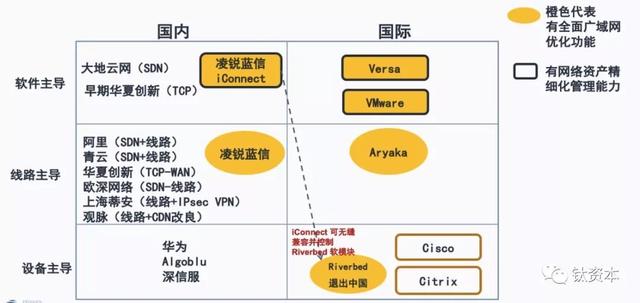 一,软件主导。国内企业有:凌锐蓝信,拳头产品为Iconnect(睿智通),主要是软件为核心的产品;大地云网,主要是SDN的软件能力;华夏创新,特别是在早期有TCP优化的软件能力。国际上主要是Versa和VMware,VMware就是被收购的VeloCloud。