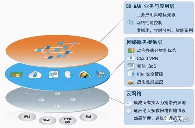 SD-WAN怎么来解决呢?SD-WAN分为三层:第一层是业务和应用层,SD-WAN可以面对业务层、应用层进行一个优先级的策略梳理、流程梳理,现在可以做到模块的定制化以及网络性能的控制、虚拟化、实时分析、智能识别等;第二层是网络服务提供层,当第一层梳理好后再调动网络的功能层,比如动态智能路由、QOS、安全管控、性能监控、VPN等;第三层是云网络,也就是SD-WAN的终端,可以接入MPLS、3G、4G、PPPOE、ADSL、NEPL专线、SDH,之后依靠软件的能力把不同的线路绑定在一起,形成一个虚拟的逻辑带宽资源池,也就意味着网络线路可以随时调动、实时使用,形成双活或者多活的状态。