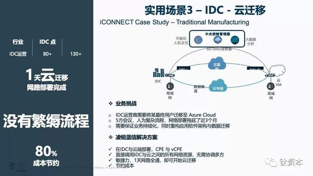 SD-WAN能避开复杂的流程,因为SD-WAN部署非常快、企业有控制权,可以部署在数据中心或云上的VCPE(虚拟终端),之后线路相当于变成了SD-WAN管控,可以调动SD-WAN的各种优化能力进行数据迁移,同时确保业务的连续性。