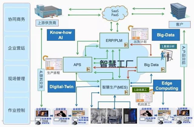 工业互联网的中间是智慧工厂,智慧工厂里有ERP、PLM、Big Data、APS、MES等系统,客户通过SaaS或者PaaS连入智能工厂,同时连接上游的供货商、连接物料,在工厂里完成制造后连接仓库、出货、快递等,形成一整套的流程。