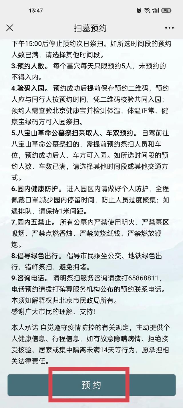 预约成功后提前保存预约二维码,预约人应与同行人按预约时间,凭二维码核验共同入园;预约人需查验北京健康宝并检测体温,体温正常、健康宝绿码方可入园祭扫。设立绿色便捷通道,保障老年人等特殊群体祭扫需求。