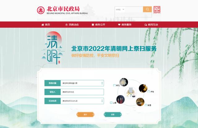 公众可登录首都之窗、北京市民政局及各区人民政府官方网站,点击“2022年清明节网上祭扫服务”专题,即可通过网络追思先人。