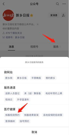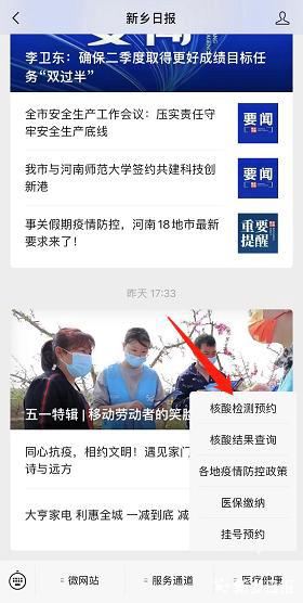 点击服务栏,选择核酸检测预约,进行预约信息填报