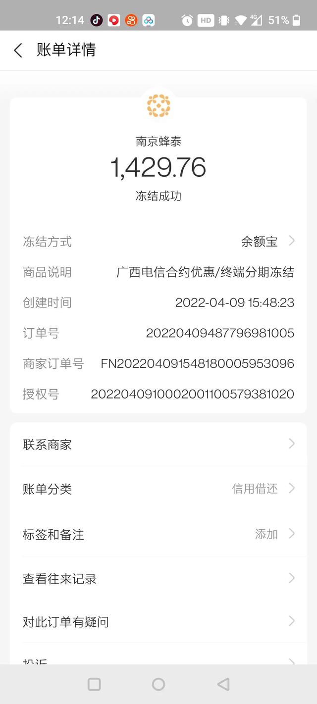 工作人员拿着天猫精灵过来,然后在电脑登记资料,登记资料的时候还不忘教隔壁的人员如何操作。这时候我家小儿子就特别困,我就抱着他睡着了。工作人员再次想我确认:这个电信手机号的套装199元一个月的必须要继续使用二年。我说好的,明白。她操作完登记信息后,她突然问我用不用支付宝,支付宝上面有没有钱!?我说支付宝有钱。她就让我在支付宝余额宝里面转进去1430元,转进去后就扫码她电脑的一个电信二维码。她一边说一边拿我手机操作扫码,因为我家小儿子抱着睡觉,有点吵闹那种。所以我在还没有反应过来的情况下,她已经帮我扫码完成。扫码好了以后,我看了一眼,显示转入1430元到广西电信那里。她还在滔滔不绝的说:这个钱不是转到里面的,这个钱还是在你支付宝余额宝里面,只是这个钱暂时冻结了,要三个月后才能慢慢开始使用。她边说边按我手机,我再看的时候已经完成操作了。这时候我看到一个什么分24个月给我返还钱的字眼。我就说这1430元是24个月以后才能全部返还回来??她说是的,你可以放心,这个钱都在你余额宝里面冻结,不会少钱的,而且这个钱每天还有利息的,还有如果少钱了你过来找我。
