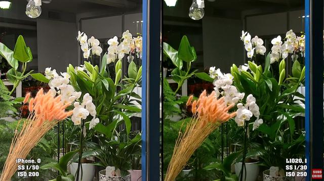 第三张对比图中可以看出,右侧的Lumia1020画面相比iPhone13Pro暗了一些,背景的建筑亮度也不足,近景的绿植还是有些模糊,尤其是照片右下角,Lumia1020解析力完全输给了iPhone13Pro,不过色彩鲜艳度上Lumia1020还是很浓艳的。