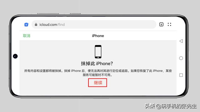 8、最后在确认窗口点击“继续”,系统便会为手机发送一条恢复出厂设置的指令,当手机为联网状态时系统会自动执行恢复出厂操作,这样就解除了锁屏密码。