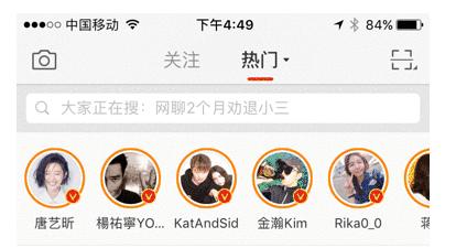 首页第一列是直播。一列头像+名字,可能是某微博的头像和名称都变动性高,这里可以适当介绍一下在直播的是什么领域的人,或者基于什么推荐原因推荐的。随意点进去发现是在直播吃火锅,饥肠辘辘的我秒退了。