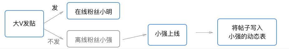 大V发动态,只同步发布动态给同时在线的粉丝,离线的粉丝上线后,再去拉取动态。来完成推与拉。