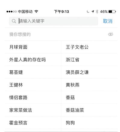 顶部是个人资料,搜索栏,搜索栏和大部分资讯类一样,有最新热点词汇,历史搜索等。