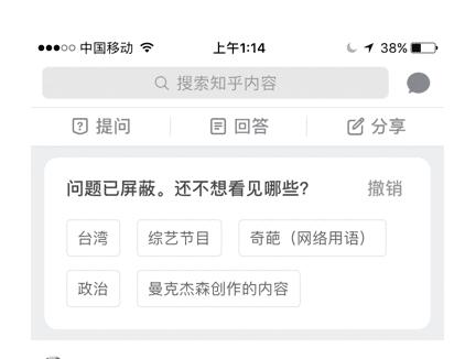 存在多次刷新热门问题依然置顶的情况,对于没有关注并且没有兴趣的话题反复出现,用户是反感的,还好可以屏蔽,并且可以屏蔽同一规则内容。对于手滑党容错性佳,可以撤销。