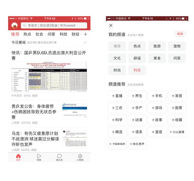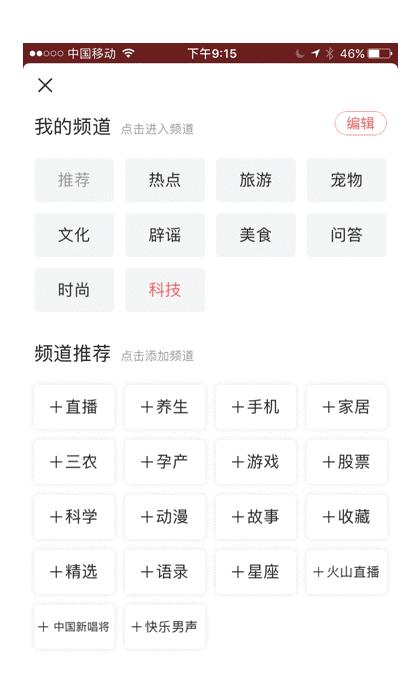 搜索栏下面是频道标签,横向滑动,几乎是不限制的,最多可以增加30个左右标签,标签右边是频道筛选,归类十分全面。