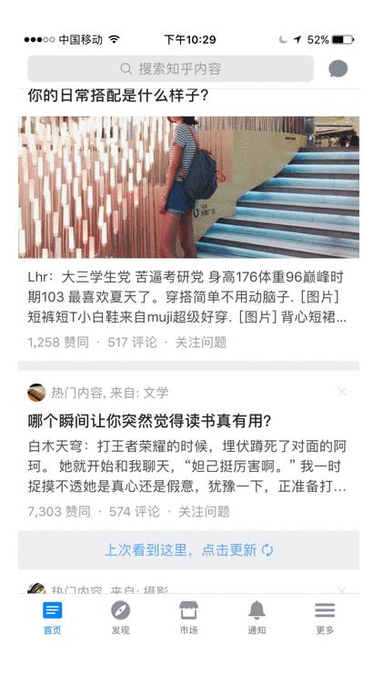 在内容里有“上次看到这里,点击更新”的功能,但是这个功能并不是真正定位到上次看的地方,而是停留在刷新后的第十条。大多用户以碎片时间来看或者用户中途流失率高,适合这样做一个标记。网易新闻等资讯类都有这个设置。
