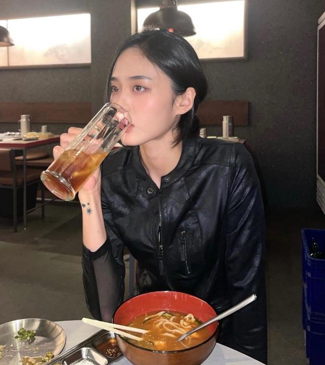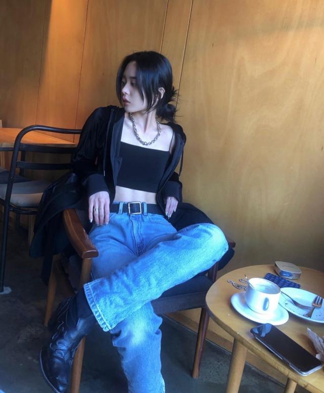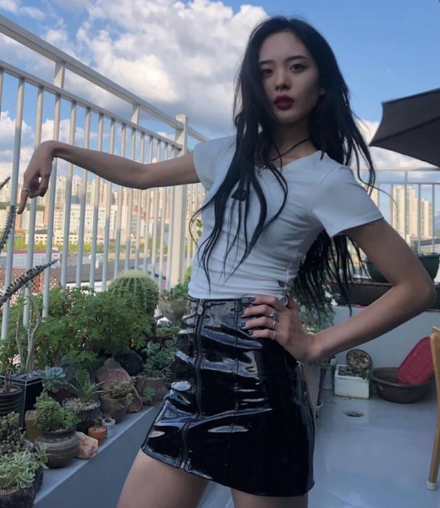 chaeny皮裙都能驾驭自如,搭配简单的字母T恤,高腰的皮裙有种猫系女孩的野性。