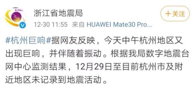 事情发生后,浙江省地震局发布微博:据网友反映,今天中午杭州地区又出现巨响,并伴随着振动。根据我局数字地震台网中心监测结果,12月29日至目前杭州市及附近地区未记录到地震活动。