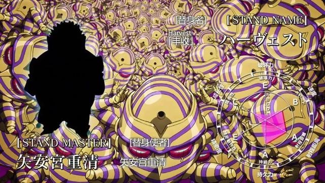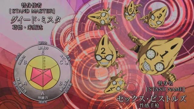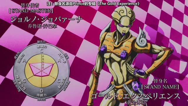 黄金体验:人型,能力是向非生物体内注入生命能量使之变化为小型动植物,若攻击它们的话则伤害会反弹到攻击者身上,也可以变出生物体身上的一部分来填补缺损的部分,若向生物体注入生命能量的话则该生物体的意识会暴走,对疼痛之类的感觉会变慢。这个设定后期似乎就没看到过。