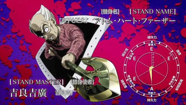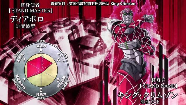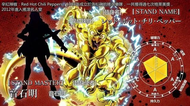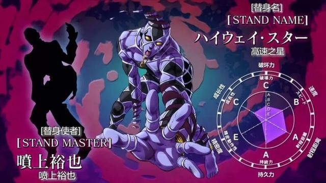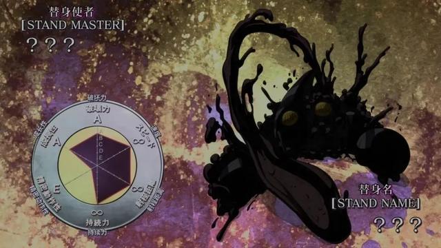 替身面板属性:破坏力A,速度,射程距离和持久力都是无穷大,精密度为E,成长性A。