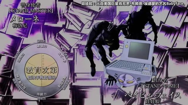 面板属性除了持久力A,其他都是E,没有射程距离。这种技能型替身除非找到弱点,不然任你力速双A也逃不走,白金之星来了,也得乖乖待在里面。