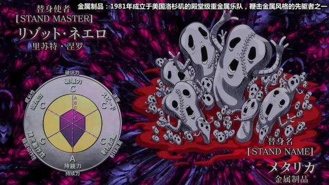 面板属性:破坏力D,速度C,射程C,持久力C,精密度A,成长性C,这个反正不属于战斗型替身,也没啥战斗力。