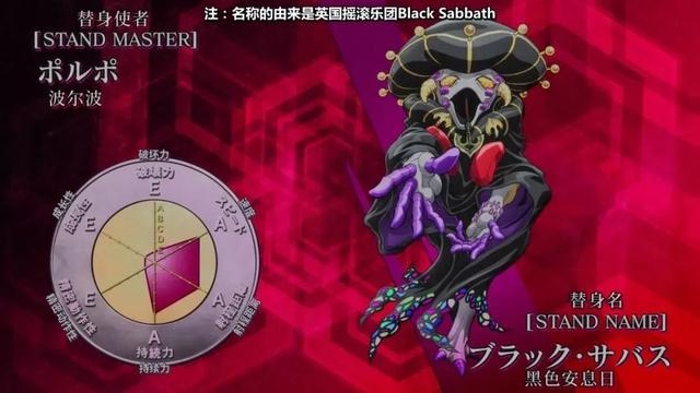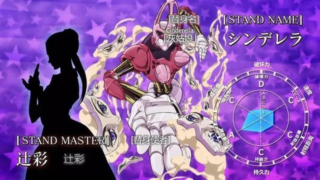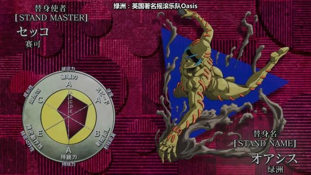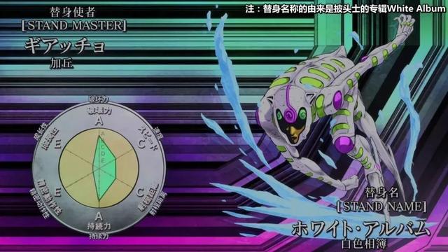 面板属性:破坏力无,速度B,射程距离A,持久力A,精密度E,成长性无。是个奇奇怪怪的替身,预言类。