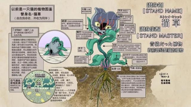 替身名为:迷途猫,体化型,将埋在土下的自身(猫咪)转化成植物。植物外貌动作、习惯如猫一样,可控制周围空气,发射空气弹进行攻击。