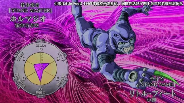 面板属性:破坏力D,速度B,射程E,持久力A,精密度D,成长性C。面板属性一般,但是这个能力很厉害,缩小的能力,和第六部DIO腿骨育成的婴儿很像,但是那个婴儿的能力绝对更加的变态。