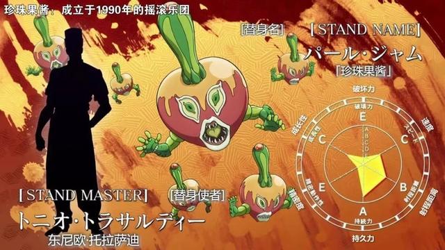 托尼欧·托拉萨迪的替身“珍珠果酱”,复数型/细小型,依附在餐点上,食用后能治愈疾病,具体效果取决于食材的种类与品质,但对重病和疑难杂症无效。破坏力E,速度C,射程B,持久力A,精密度E,成长性C。