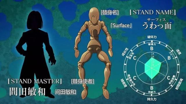 面板属性破坏力、速度、持久力为B,其他均为C。这个能看见的替身木偶应该也是能替换的,毕竟这个木偶彻底被仗助打碎了,而间田敏和又没死,说明这个替身还可以重新替换。
