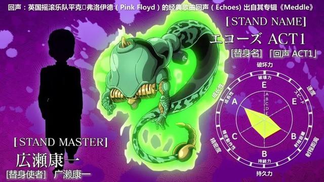 这是唯一能三段进化的替身,每一次进化样子都会改变。就说最后一个阶段吧,回音ACT3,矮小人型,借由攻击增加目标重量,使对手重到无法行动,但一次只能使一个地方变重。