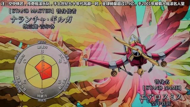 面板属性:破坏力B,速度B,射程B,数十米,持久力C,精密度E,成长性C。替身的面板一般,能力上也没有特别厉害的技能,全靠小飞机自己发挥,作为侦查还是很好用的。