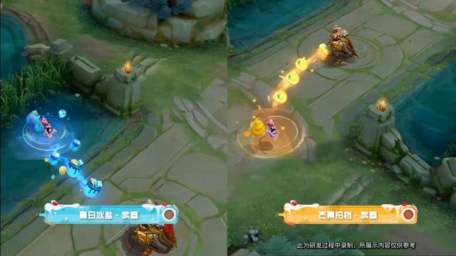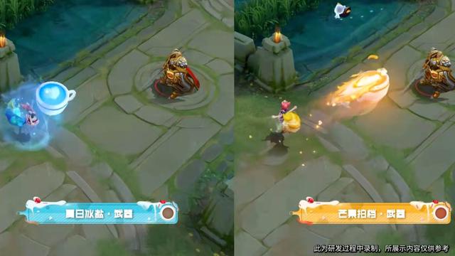 再来看二技能特效,夏日冰盐的二技能特效和原皮肤有很大的差别,看起来并不像是一杯咖啡,反而更像一杯冰淇淋牛奶。而芒果拍档则是像一杯热气腾腾的芒果牛奶,飞出去的时候还散发着阵阵热气。