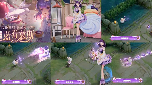如图所示,上图就是女仆咖啡的星元蓝莓慕斯的局内特效了,这款皮肤的特效颜色是紫色的,符合蓝莓这种水果的颜色。技能样式上面也做出了一些改变,离谱增加了小兔饼干,蛋糕上面的水果换成了蓝莓。另外这款皮肤的海报也是有变化的,拥有独立的海报,所以也是一款不错的星元。