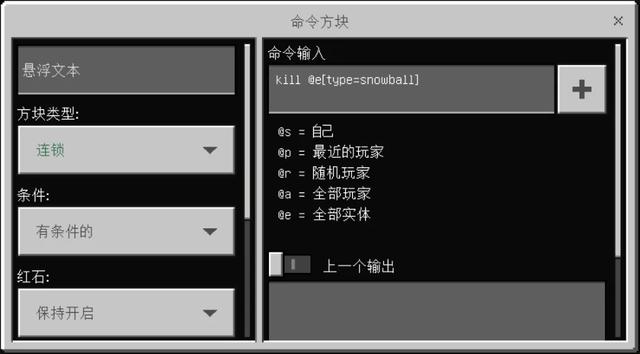 然后我们需要清除掉扔出去的雪球,因此要在5、6号两个命令方块中都输入下面的指令kill @e[type=snowball]。方块类型设置为连锁,条件为有条件的,红石设为保持开启。