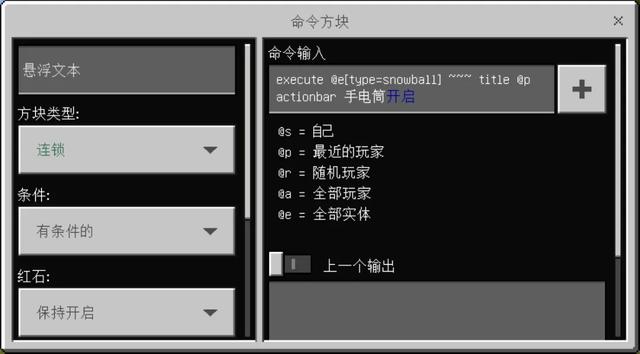 接下来我们需要在3、4号命令方块中分别输入如下指令execute @e[type=snowball] ~~~ title @p actionbar 手电筒§1(想要的颜色数字)开启execute @e[type=snowball] ~~~ title @p actionbar 手电筒§5(想要的颜色数字)关闭。方块类型设置为连锁,条件为有条件的,红石设为保持开启。