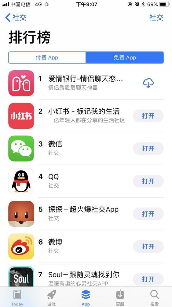 “爱情银行”冲至App Store免费社交榜第一名。