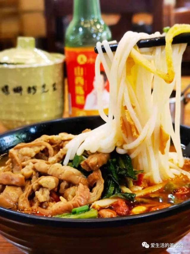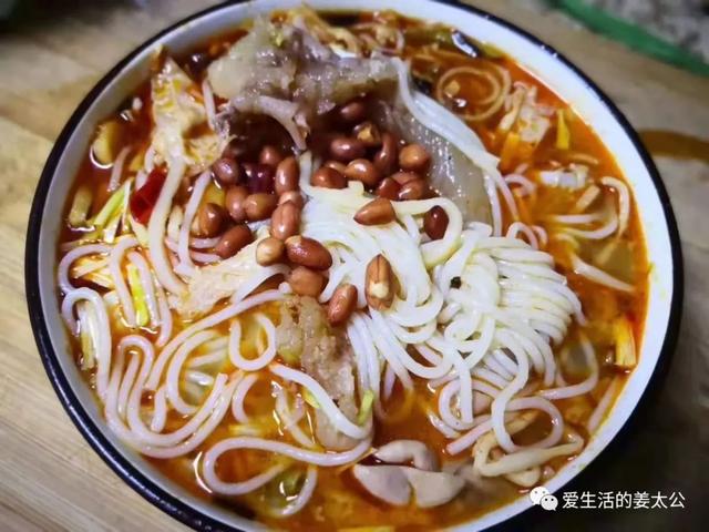 猪骨、牛肉、螺蛳熬汤,家乡寄来的干粉煮好,搭配酸笋、油炸腐竹和油炸花生,要了微辣的,捞出几根他自己卤制的肥肠,切成细条,量真不少,确实喜欢他家的粉。