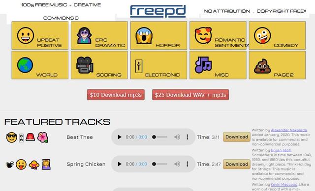 特点:一个允许用户下载、上传音乐素材的网站,除了音乐,还有丰富的走路、翻书、鸟叫等音效,下载上传均需要注册,同样也要注意每条音频单独的版权声明。