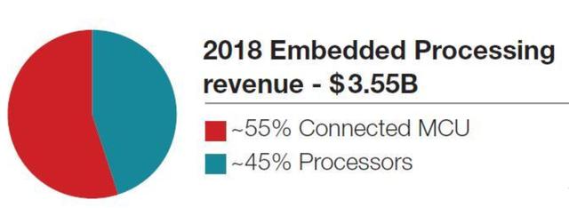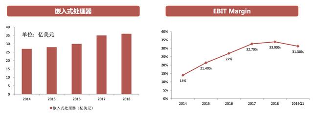 与模拟业务一样,嵌入式处理业务的EBIT利润率近年来也在一路上升,从2014年的14%提高到2018年的34%,仅5年就实现了20个百分点的提升,表现相当亮眼。