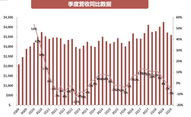 从历史数据来看,公司收入存在一定的季节性。通常每年第一、四季度的收入要低于第二、三季度的收入。公 司从2016年第二季度开始,到2018年第三季度结束,季度收入连续经历了10个季度的同比增长。而在2019年 第一季度,公司已经经历了连续两个季度的同比下降。公司最近的收入疲软主要由于半导体周期。从历史数据 来看,每次半导体周期持续的时长往往不同,但通常情况下,会在经历4到5个季度的同比下降后,才开始恢复同比增长。