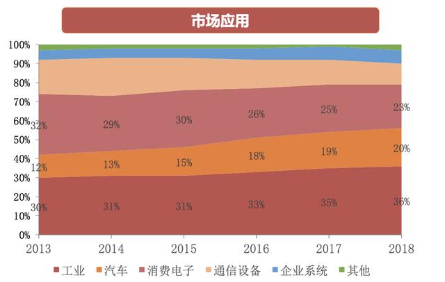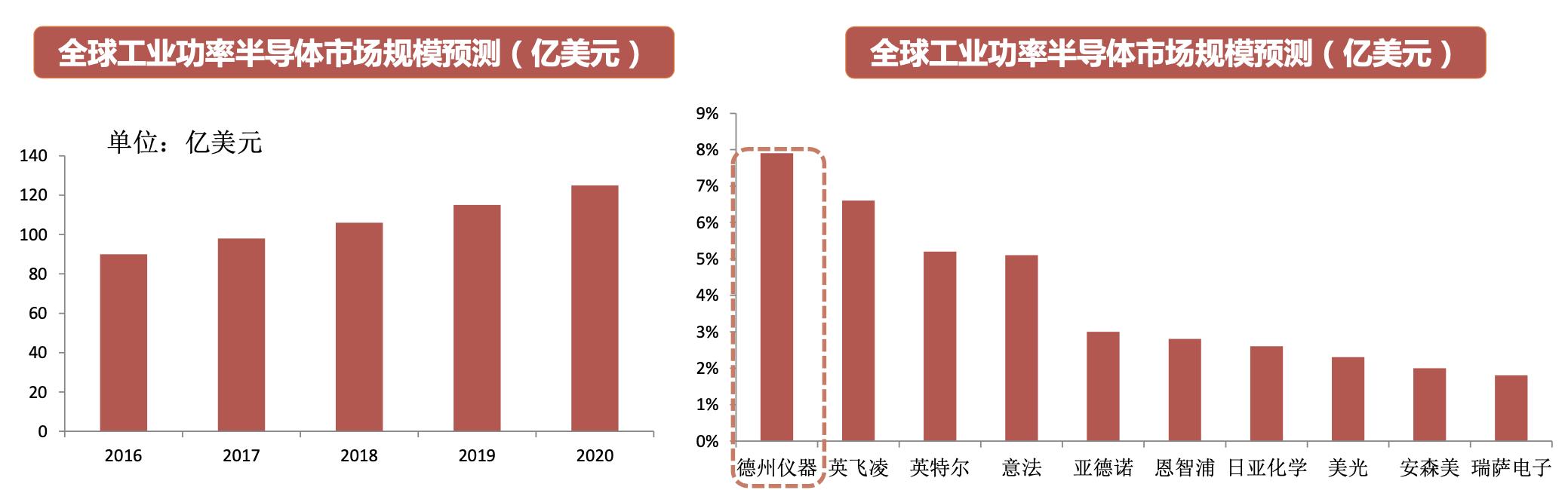 2016年全球工业功率半导体市场规模约为90亿美元,预计2018年市场规模将超100亿美元,2020年规模 达125亿美元。在2015年,德州仪器(TI)营收达137亿美元,整体成长远超半导体市场的平均增幅。 目前该市场仍不具有占居主导地位的单一或少数几家半导体供应商。2016年全球工业半导体市场前十大业者的合计市占40.9%。其中排名第一的德州仪器占7.9%。回溯工业领域的相关处理器发展,德州仪器还发明了工业界的第一个DSP芯片TMS5100,加上业界大牛(如集成电路发明人杰克•基尔比)的加盟,让德州仪器能够长久保持领先。
