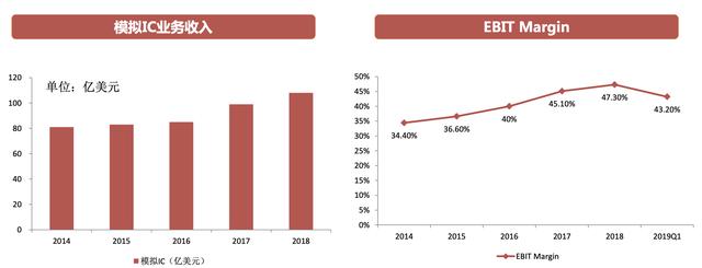 2006年-2018年,模拟业务的收入逐年上升,CAGR为8%。2017年,该业务收入取得了16%的同比增长,为过去 5年的最高增幅。2018年,模拟业务同比增长9.1%,为108亿美元。模拟业务的EBIT利润率在过去5年里一路上升,从2014年的34.4%升至2018年的47.3%。这主要得益于公司近年 来生产技术改进所带来的毛利率的提升。2019年第二季度,EBIT利润率上升至48.17%(2018年第一季度: 45.4%)。