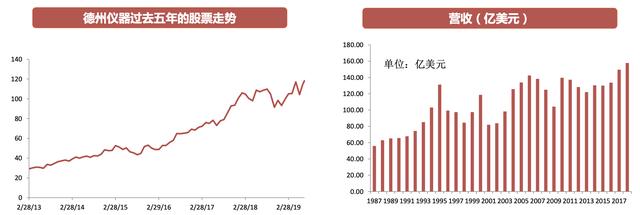 德州仪器是近几年动荡半导体产业里,前十厂商中唯一一个没有“大动作”(例如收购,兼并)的厂商。虽然没有大动作,但德州仪器的市场表现并不含糊,在过去的五年,德州仪器的 股票从$27涨到了接近80美元的价格,市值也翻了一番不止。股票市场的优越的表现来自其业 绩的支撑。2018年度,德州仪器营收157.84亿美元,较2017年149.61亿美元增长了5.5%。而净利润则为 55.80亿美元,较之2017年的36.82亿美元增长了51.55%。