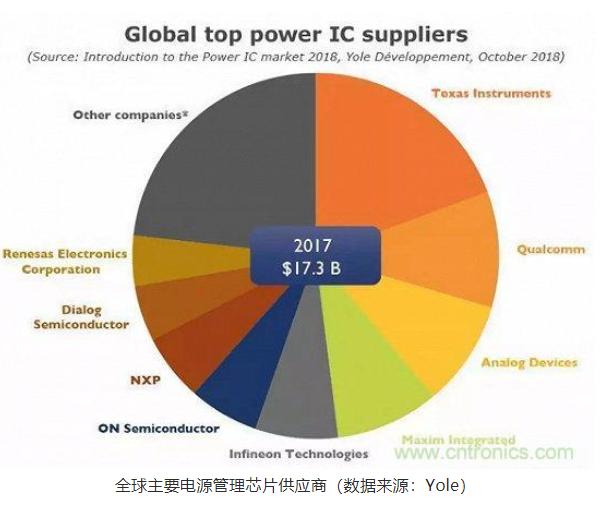 电源管理芯片是一颗用来解决设备内模块的用电需求管理的模拟芯片,行业规模约在250亿美金附近,行业成长性在0-5%附近,主要下游应用领域来自通信30%,汽车20%,消费电子20%和工业20%。主流玩家包括德州仪器(TI)18%,高通9%,ADI6%,英飞凌6%,NXP5%等,相对比较分散。