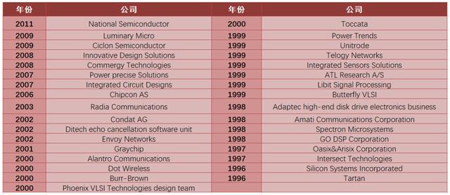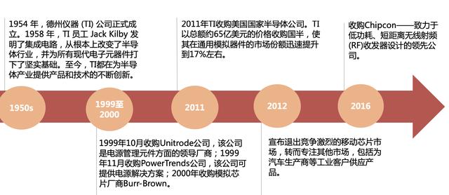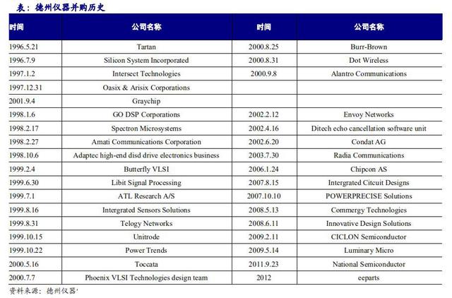 自 1996 年起,德州仪器为了进军模拟芯片行业,开始大规模的收购和资产剥离,据不完全统计,1996 年-2012 年德州仪器进行了 34 次收购。其中几次重大收购为 TI 在模拟 IC 行业的发展奠定了基础。据不完全统计,在 1996 年-2010 年公司共进行了 18 次资产剥离,将盈利能力较差的业务和部门打包出售给其他公司。完成一系列的收购和资产剥离后,德州仪器从“大而全”的模式向“专而精”的方向发展,聚焦模拟 IC、MCU 与嵌入式处理领域。