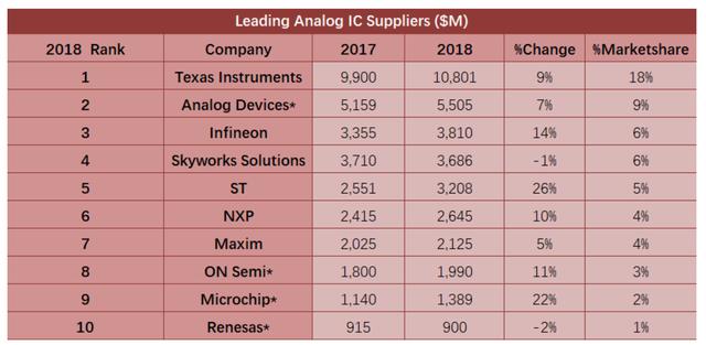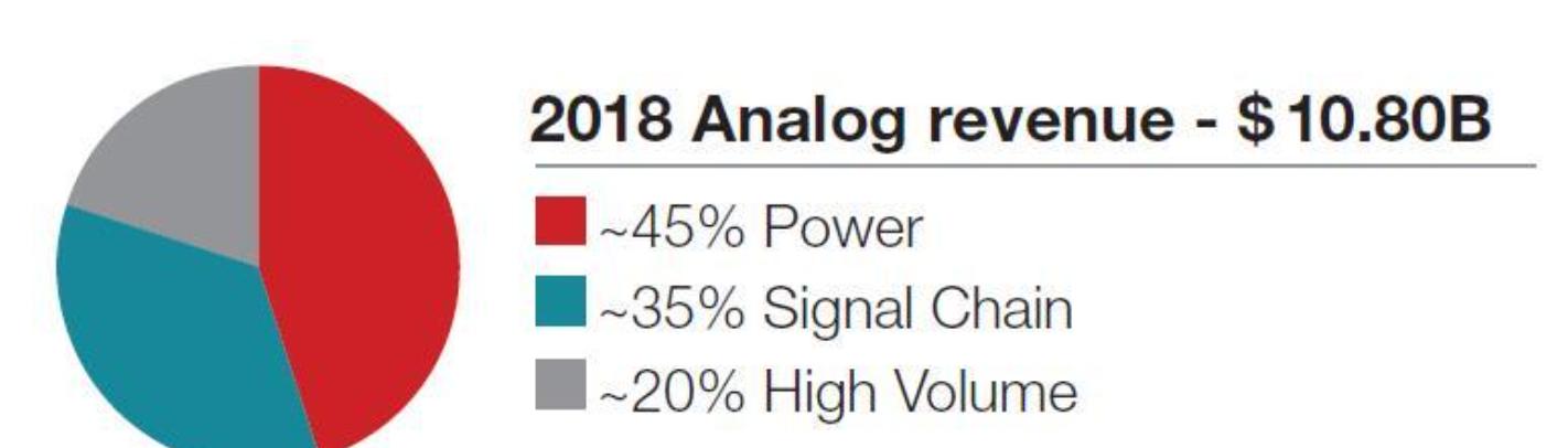 模拟是德州仪器最大的细分市场,2018年的营收为108亿美元,约占总收入的68%。模拟的市场2018年将达 到530亿美元左右且在不断增长,德州仪器拥有大约19%的市场份额,占据领先地位。