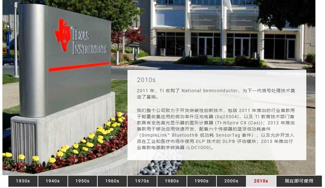 2011年4月,TI宣布与美国国家半导体(National Semiconductor)签署最终协议,TI以总额约65亿 美元的价格收购国半。对美国国家半导体的收购给公司带来了5千名员工,以及多达4.5万种模拟集成电 路产品和客户设计工具,极大程度地扩展了公司的模拟业务。