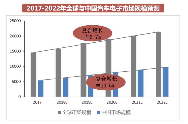 2017年全球汽车电子市场规模接近2300亿美元,预计到2020年将达到3000亿美元。汽车高增长积累起来的庞大基数成为汽车电子市场发展的动力。消费者对车载通讯、娱乐系统的需求提高也 会持续拉动汽车电子行业的高增长。随着汽车电子技术的推广,许多汽车电子技术向中低端车普及,用户对 于性能和安全的需求也在推动这种趋势。汽车电子部件在整车中的占比不断提升,部分汽车电子部件从提供 附加功能向提供基础功能转变,汽车制造商对汽车电子的需求不断增大,到2020年汽车电子在汽车中的成本将达到50%。